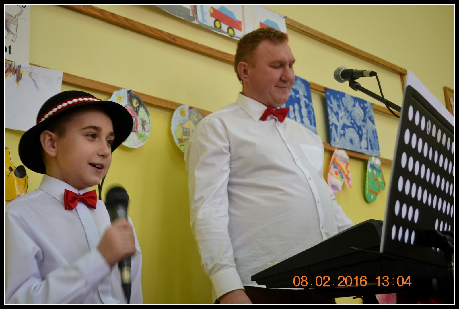 własnoręcznie wykonane przez dzieci laurki oraz świeczniki z masy solnej, jak również koncert naszego ucznia Konrada Kołodzieja ze swoim tatą.